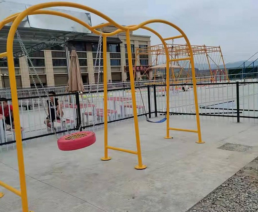 材料:型材、60圓管厚度2.0、 輪胎秋千、輪胎直徑60厘米上面繩網編織 安裝、使用鍍鋅鏈條.粉末噴涂高溫烘烤.噴塑工藝